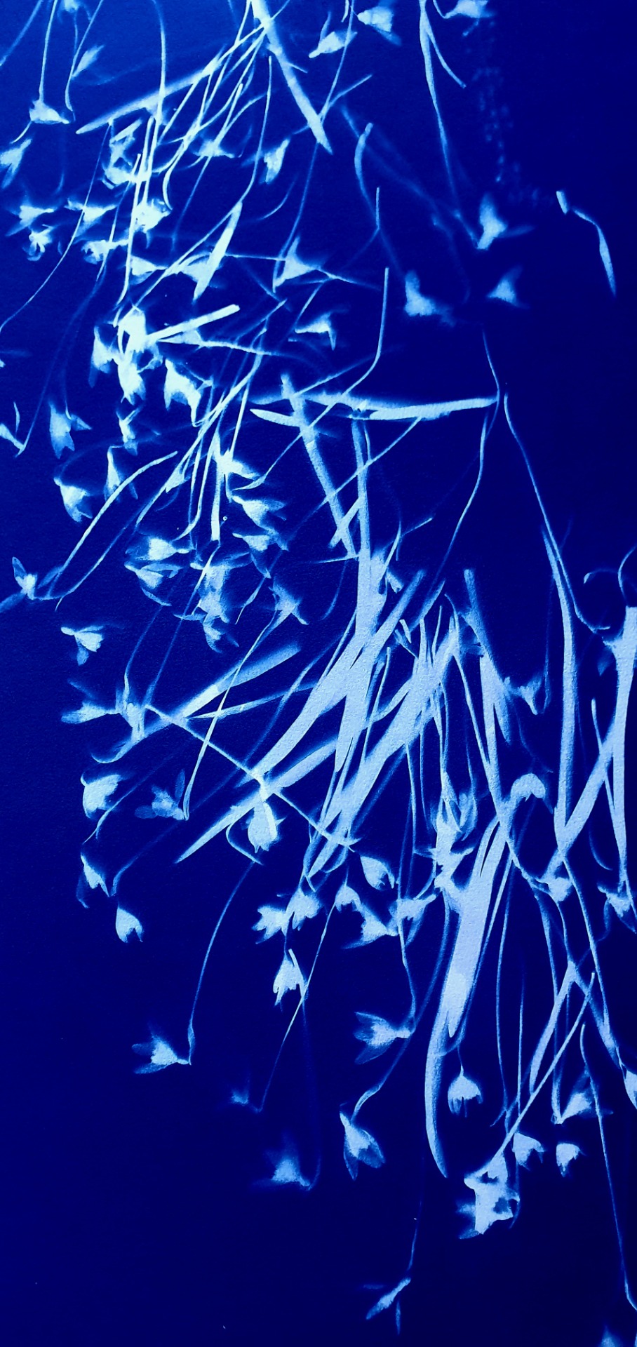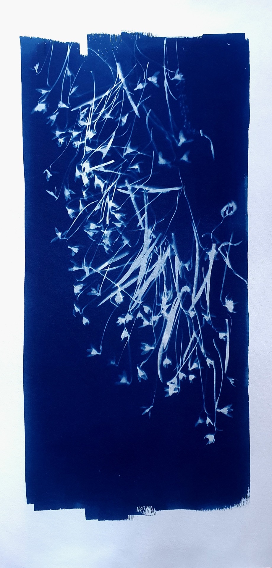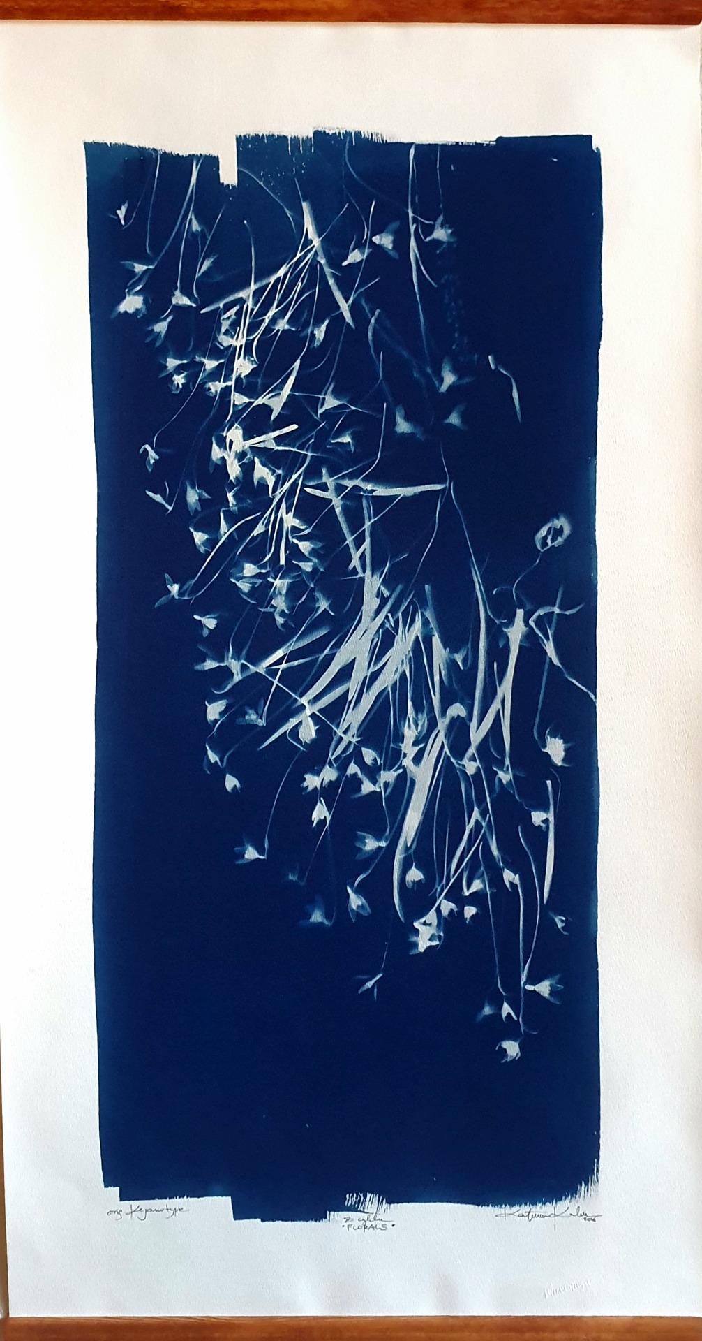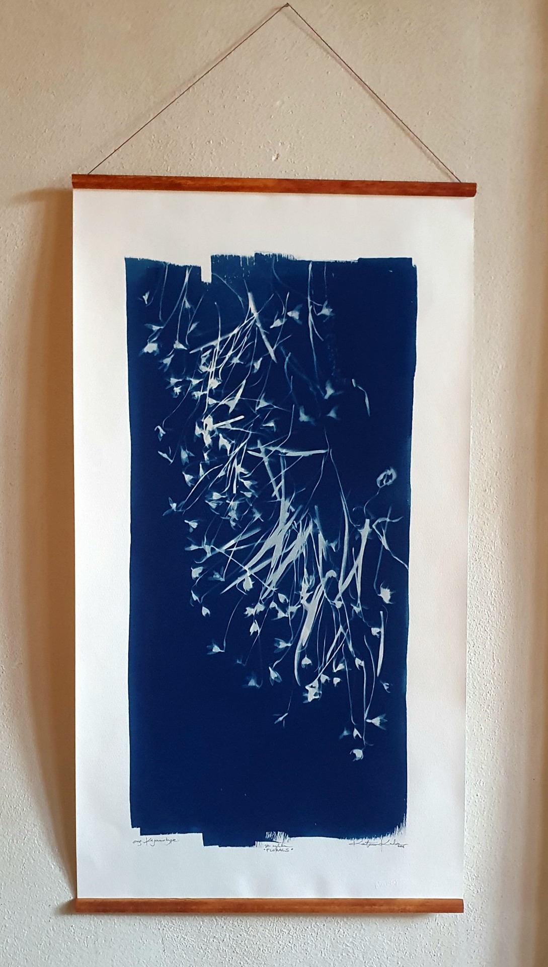 Velkoformátová kyanotypie z cyklu FLORALS. Originální provedení na ruční papír nejvyšší kvality, gramáže 350 gms s jemným rastrem podtrhujícím hloubku a intenzitu modří. Ekonomicky výhodná decentní adjustace mezi dřevěné lišty ve stylu čínské tušové malby. Lišty tónovány, snadné zavěšení na připevněný přírodní motouz. Signováno vpravo dole, opatřeno autorskou značkou, embosováno, datace 2026.