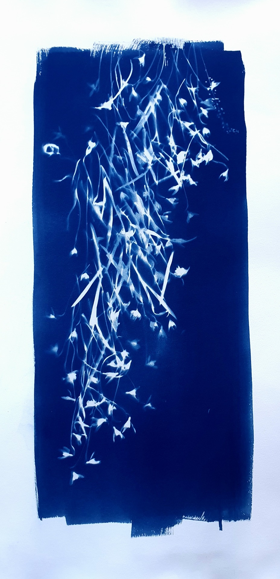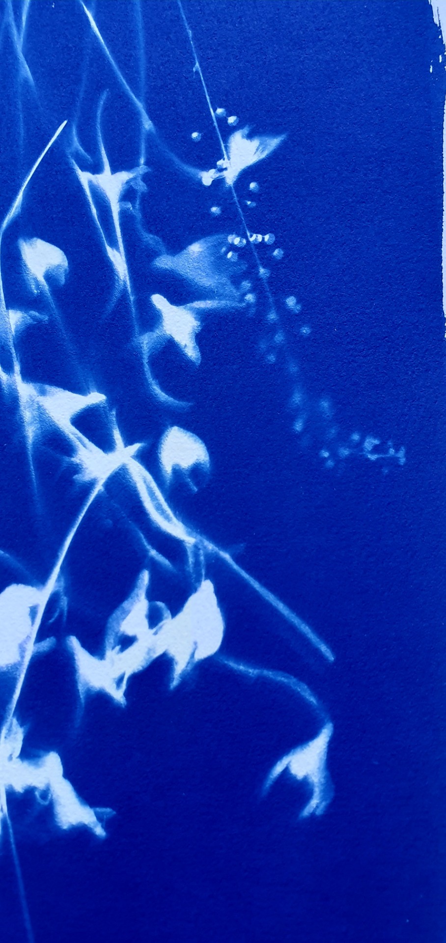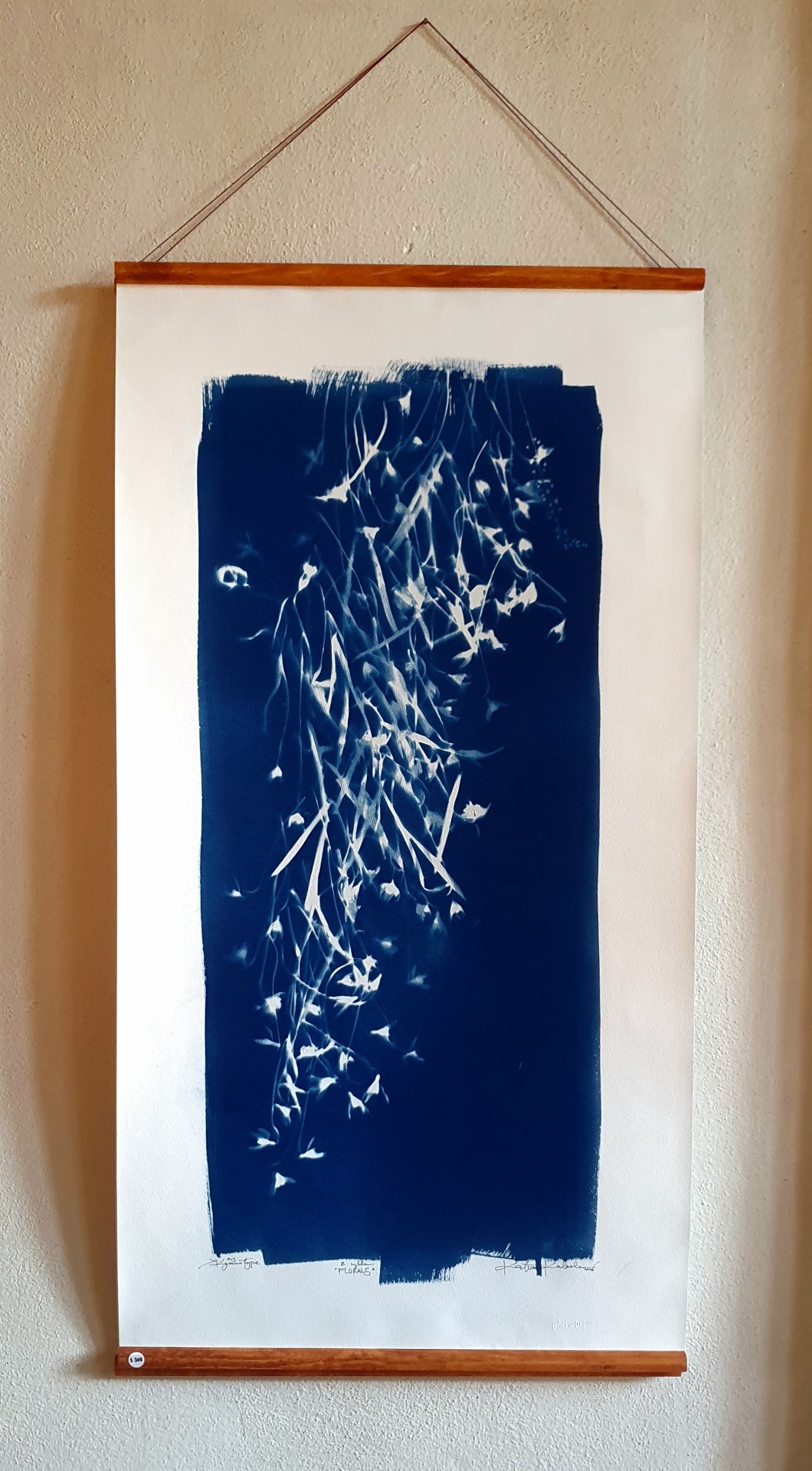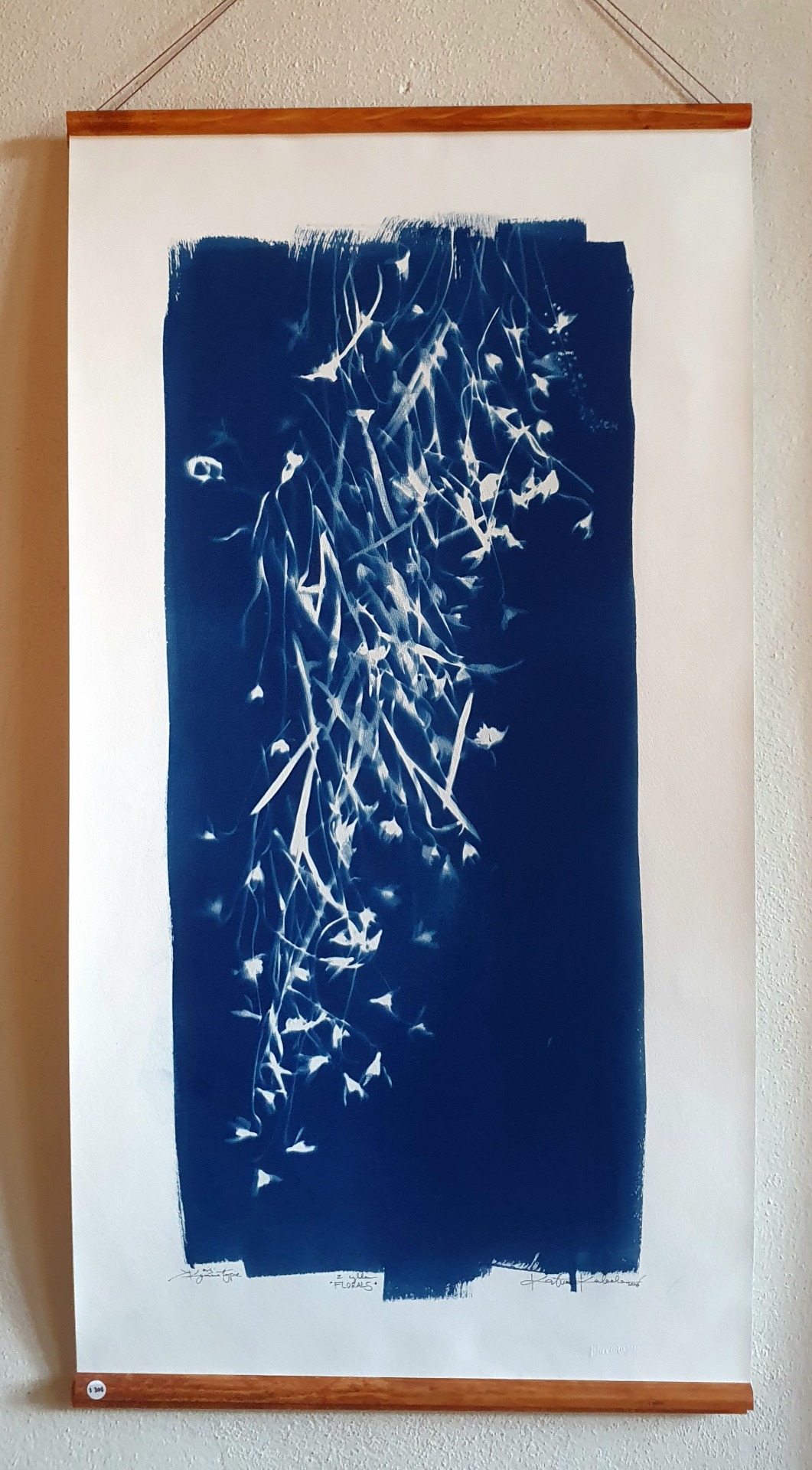 Velkoformátová kyanotypie z cyklu FLORALS. Originální provedení na ruční papír nejvyšší kvality, gramáže 350 gms s jemným rastrem podtrhujícím hloubku a intenzitu modří. Ekonomicky výhodná decentní adjustace mezi dřevěné lišty ve stylu čínské tušové malby. Lišty tónovány, snadné zavěšení na připevněný přírodní motouz. Signováno vpravo dole, opatřeno autorskou značkou, embosováno, datace 2026.