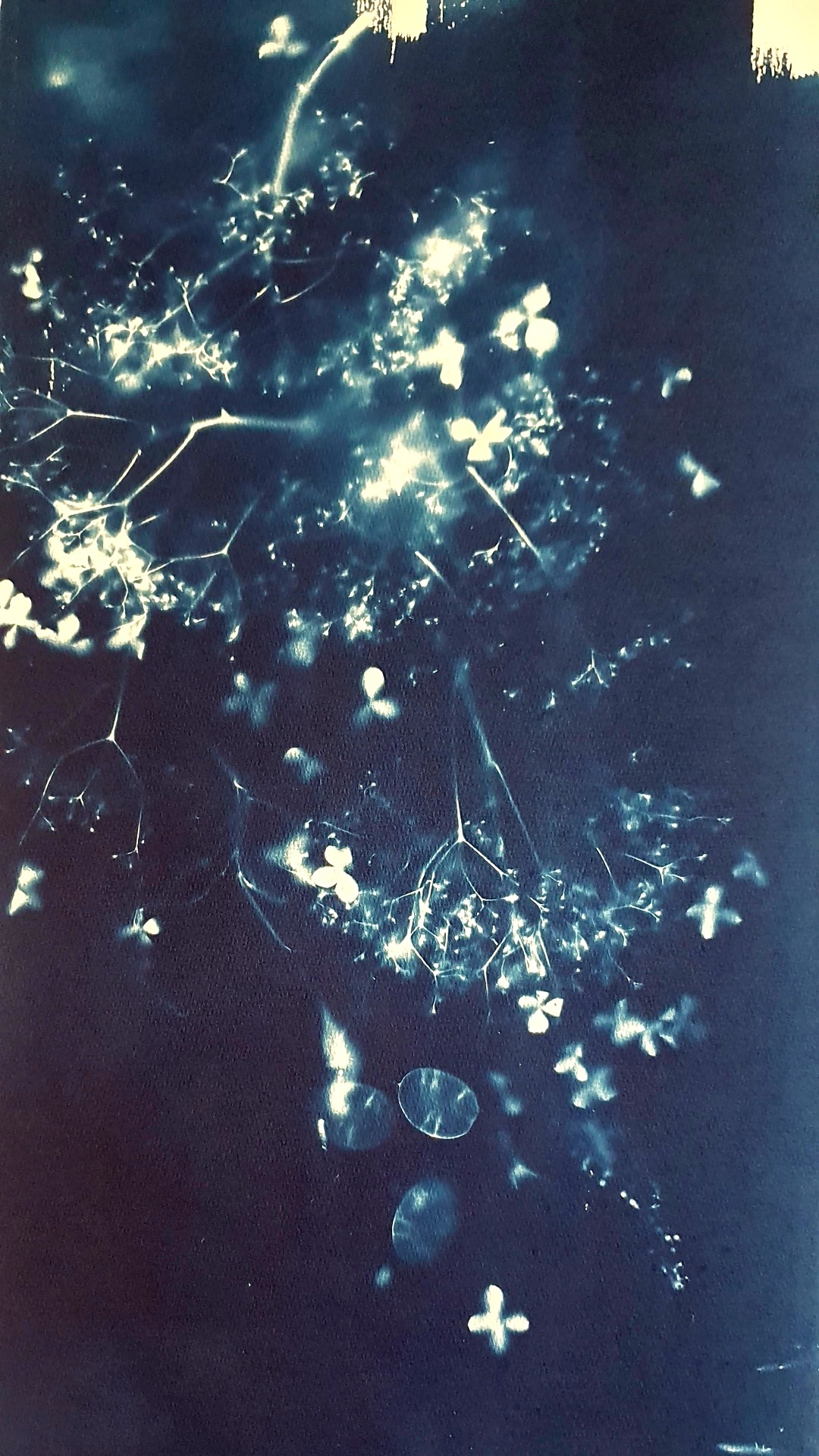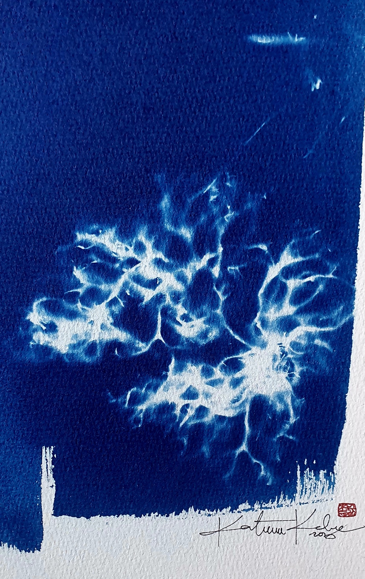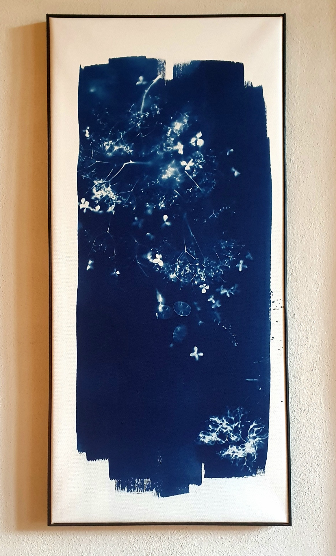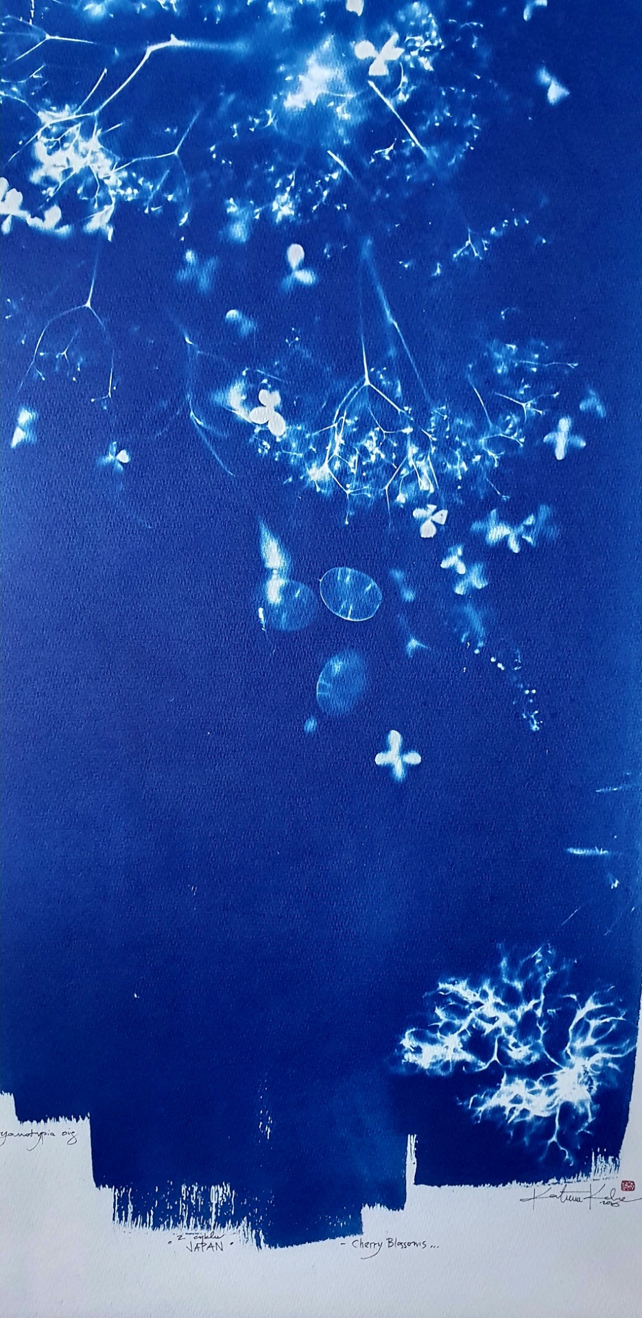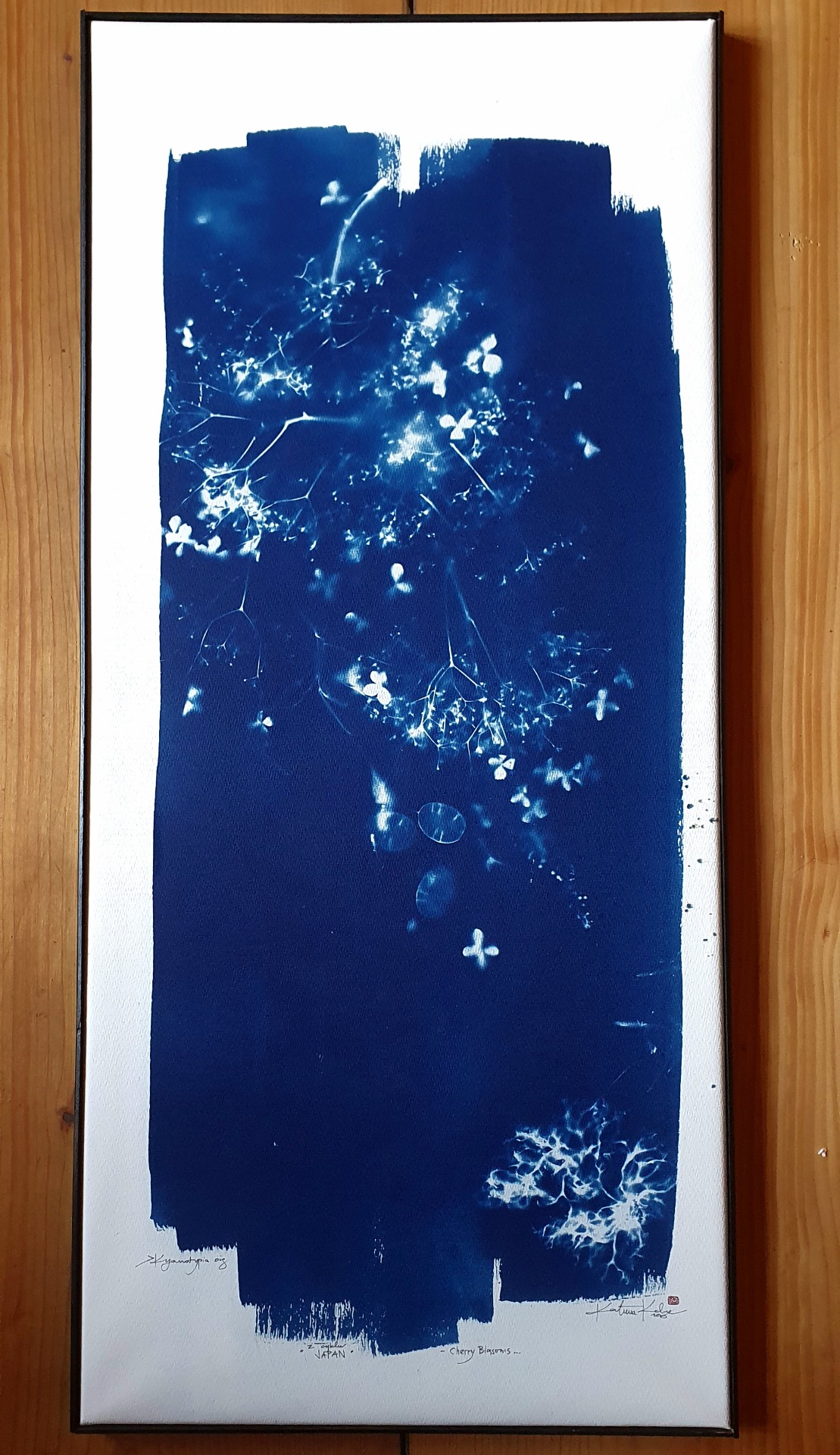 Velkoformátová kyanotypie z cyklu JAPAN - Metamorfózy Sakurových květů - Cherry Blossom Metamorphosis. Originální provedení na ruční papír nejvyšší kvality, gramáže 350 gms s jemným rastrem podtrhujícím hloubku a intenzitu modří. Autorsky vypnuto na dřevěný blindrám, opatřeno úzkou dřevěnou lištou černé barvy pro dokonalý designový charakter. Signováno vpravo dole, opatřeno autorskou značkou, datace 2026.